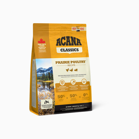 Your dog is biologically adapted for a diet that is rich in protein from animal ingredients. With fresh chicken* and turkey in WholePrey ratios, ACANA Classics Prairie Poultry is loaded with the ingredients your dog needs to stay happy, healthy, and strong.